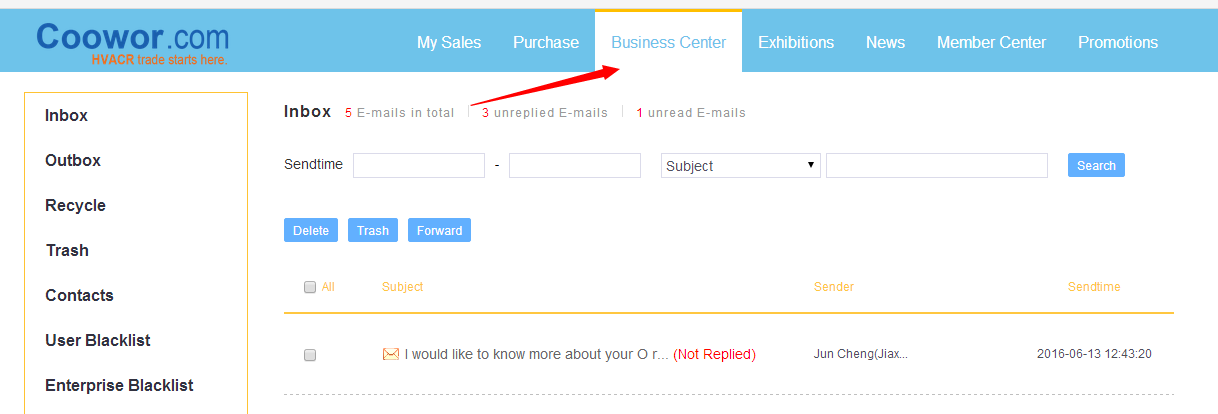 Business center: get inquiries from buyers. When you get an inquiry, please reply the buyers in a timely manner. Coowor.com will also remind you to check the inquiry at the first time by email.